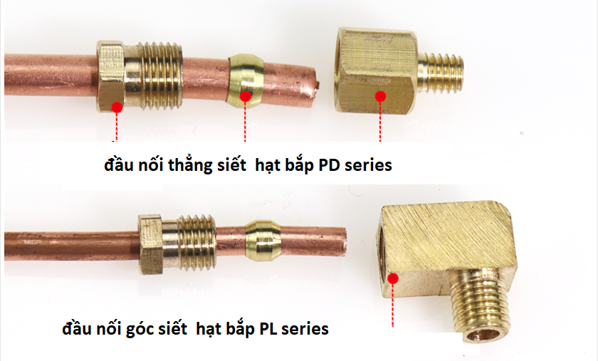 Đầu nối thẳng hạt bắp PD series gồm đầu nối , nút siêt , hạt bắp . Dùng cho hệ thống bôi trơn , sử dụng setup bằng ống đồng và ống nhựa áp cao